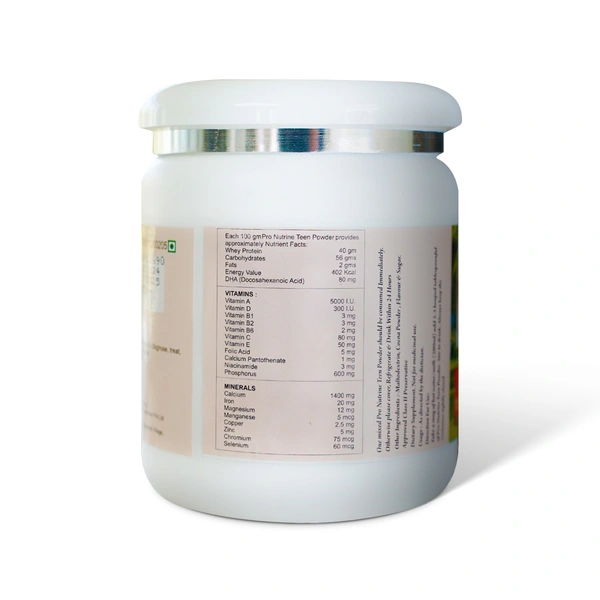 Empower your teen to excel in academics, sports, and daily activities with PRO NUTRINE Teen Protein Powder. Specially crafted for growing minds and active bodies, this premium protein supplement delivers the essential nutrients teens need to thrive. Packed with 40g of high-quality whey protein per 100g, it supports muscle growth, sustained energy, and quick recovery—helping your teen perform their best every day.