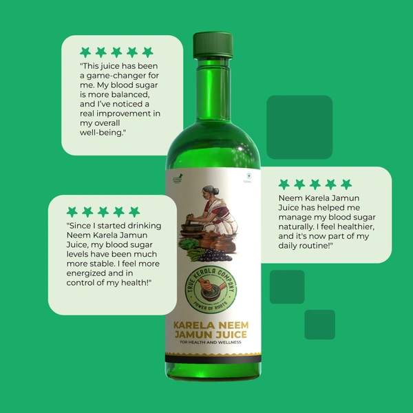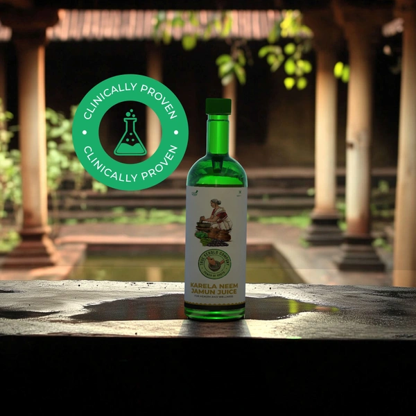 Maintain healthy blood sugar levels naturally with True Kerala Company Karela Neem Jamun Juice. Made from a powerful blend of Karela (Bitter Gourd), Neem, and Jamun, this 500ml juice is packed with essential nutrients to support blood sugar control, improve digestion, and enhance overall well-being. Ideal for those seeking a natural and effective solution for managing their health, this juice combines the time-tested benefits of Ayurvedic ingredients for a healthier lifestyle.